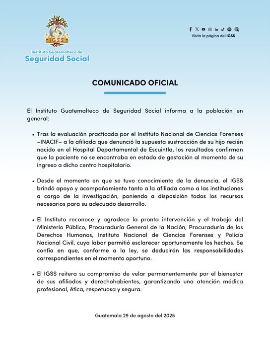 El IGSS se pronuncia ante esta farsa: que desde el inicio de la denuncia se le brindo apoyo a la afiliada y total disposición a los entes investigadores