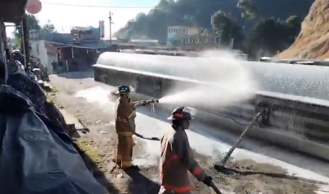 En el lugar, elementos de los Bomberos Voluntarios han establecido un perímetro de seguridad para impedir el paso de automovilistas y reducir riesgos en el sector.